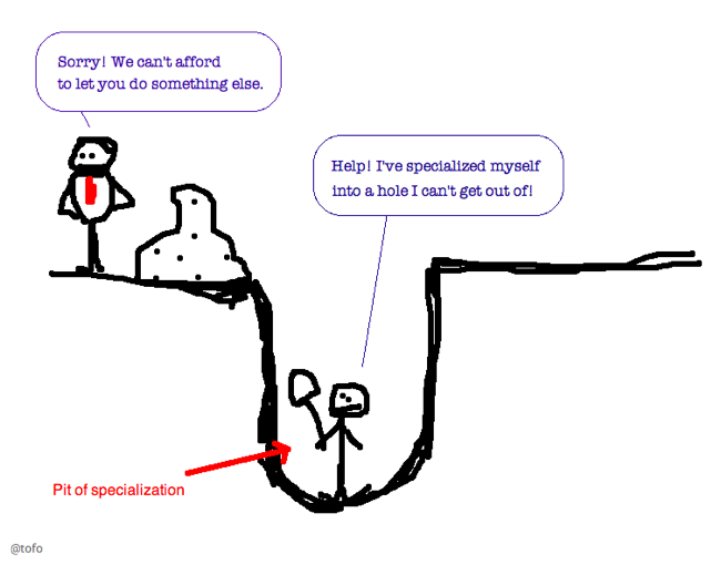 In an effort to prove I’m not a perfectionist, I’m publishing this work of art I just created, while sketching out some ideas for an upcoming talk. Being a specialist can be a double-edged sword.